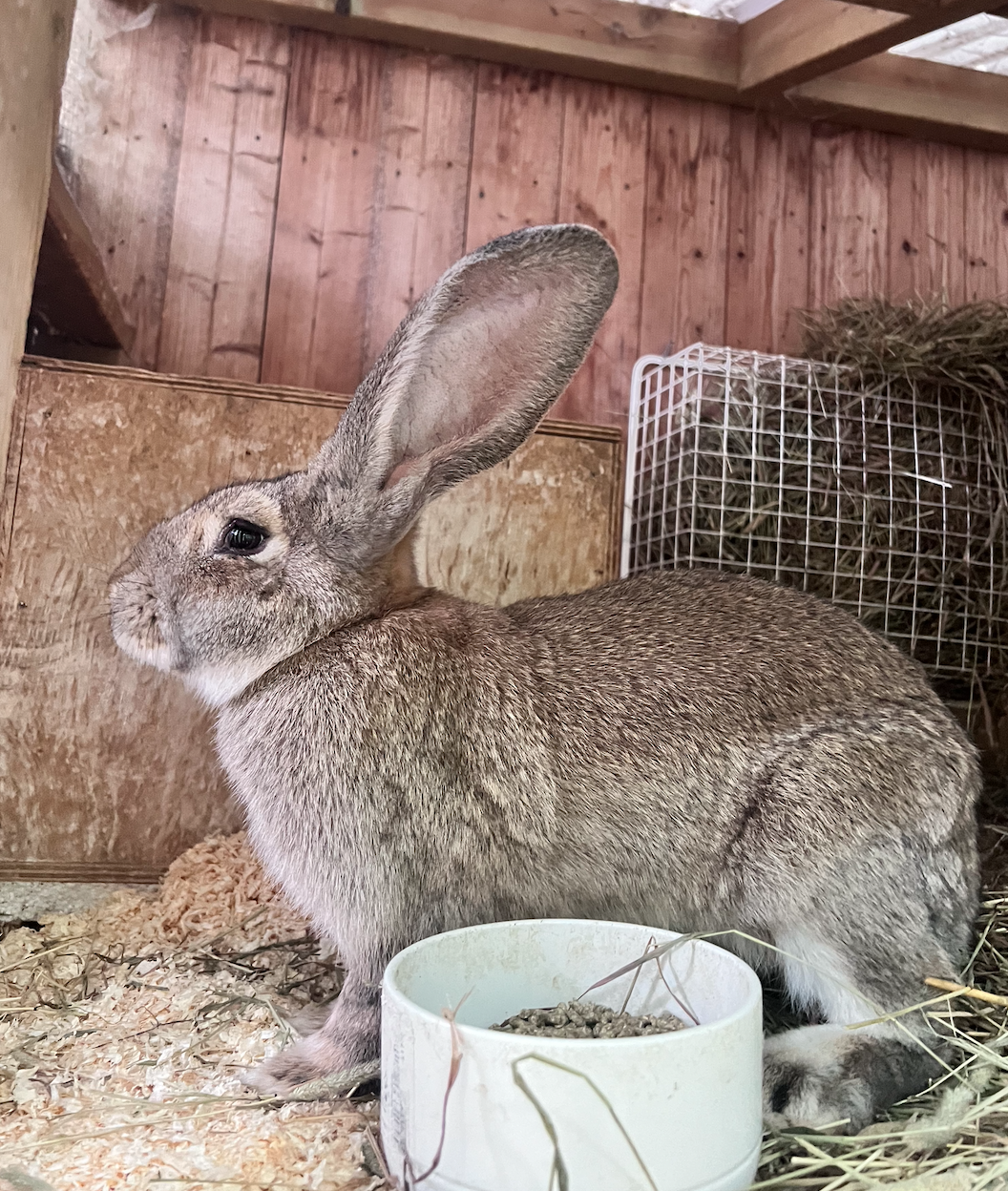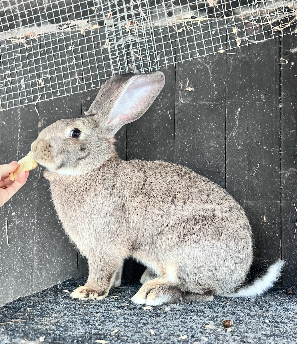 Våra belgiska jättar äter hö som vi köper av en bonde i mindre bal och pellets av märket Rabbfor som vi köper från lantbutik eller Granngården. Därutöver får de en och annan godbit förstås, så som morot, persilja, grönsaker och frukt.